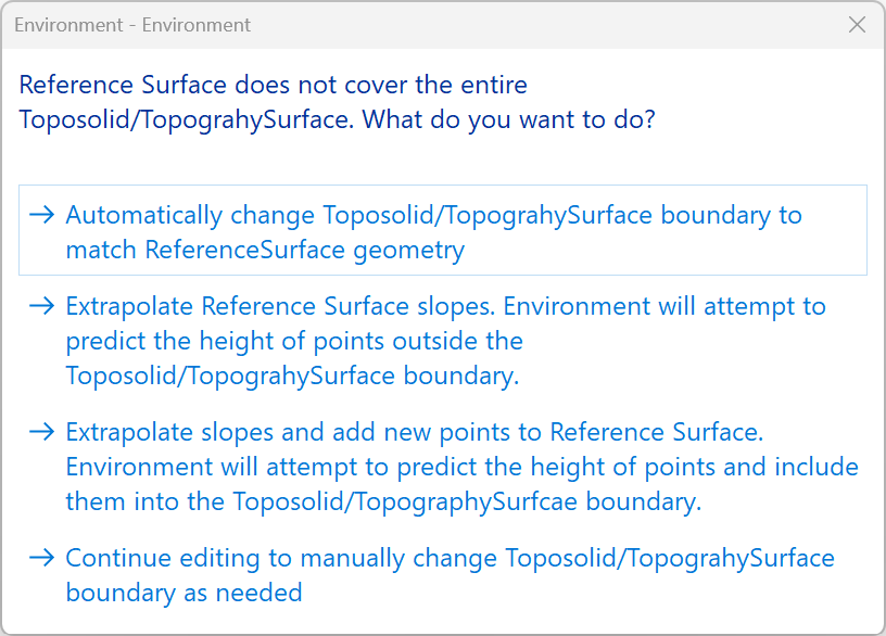 - Click on Continue without extrapolating to only apply the reference surface where applicable (the rest of the surface will not change its elevation)