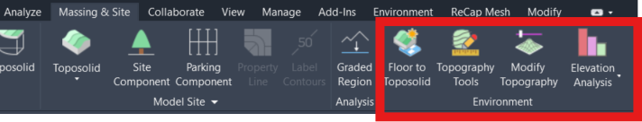 By default, Environment adds a Panel with several tools to the native MASSING & SITE tab of Revit.
